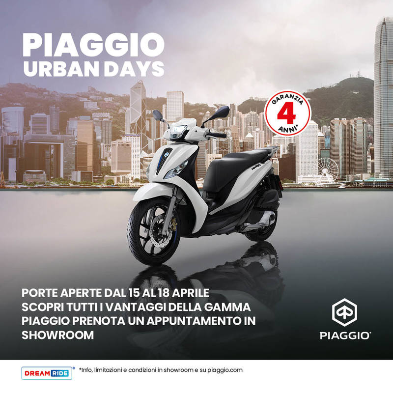 Dal 15 al 18 Aprile, da Piaggio Icardi, si celebrano i Piaggio Urban Days: quattro giorni di porte aperte per scoprire tutta la gamma Piaggio, con la possibilità di prenotare un appuntamento in showroom.